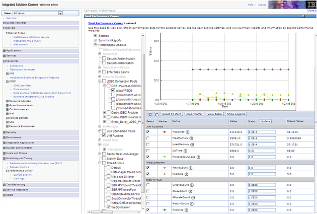 The Performance Viewer can be helpful to monitor for a small set of indicators within a single server (e.g. during development). However when you need to monitor several indicators across multiple servers on a cluster the Performance Viewer is difficult to navigate. A better tool for monitoring multiple servers at the same time is the "WAS Performance Management Tuning Toolkit".