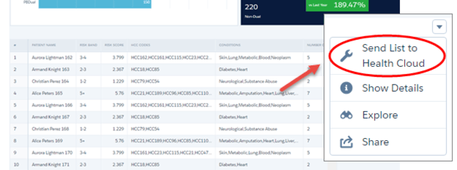 With the help of the Wave for Health Cloud Risk Stratification app, you can create a patient list and export that list to the Health Cloud console to manage these patients more effectively. Below you can see the the option for exporting the list.